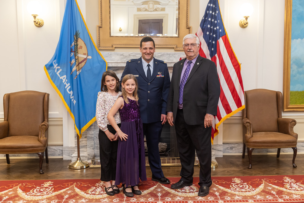 Cutline: Senator Roland Pederson, R-Burlington, recognizes Purple Up! For Military Kids Day at the Oklahoma State Capitol alongside Major Richard Cook, Executive Officer, 71st Flying Training Wing, and his daughters, Annabelle and Josephine.