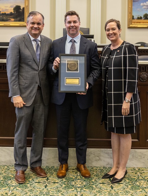 OKLAHOMA CITY – Senator Adam Pugh, R-Edmond, was recently presented with the Distinguished Service Award by the Oklahoma State Regents for Higher Education during the annual Higher Education Day at the State Capitol.