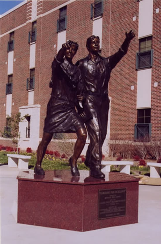 Reaching for Excellence is a monument in cast in bronze using the lost-wax method of art bronze casting. The children depicted in the statue are 1-1/4 times life size. The base is native Oklahoma granite in a hexagon shape.