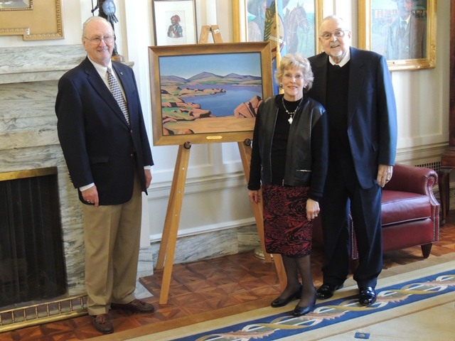 Former Sen. Charles Ford poses with the sponsors of the Jacobson painting Carlene and Bob Rollins.